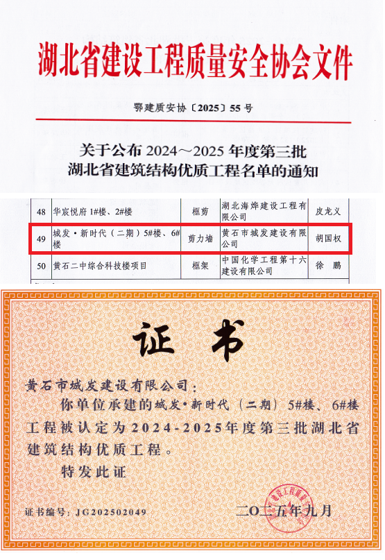 近日,黃石市城發(fā)建設(shè)有限公司承建的城發(fā)·新時代(二期)項(xiàng)目喜獲殊榮,被認(rèn)定為2024至2025年度第三批湖北省建筑結(jié)構(gòu)優(yōu)質(zhì)工程和2025-2026年度第一批湖北省建筑工程安全文明施工現(xiàn)場。這一成就不僅彰顯了項(xiàng)目部的卓越管理能力,更標(biāo)志著城發(fā)建工集團(tuán)在打造高品質(zhì)人居標(biāo)桿的道路上邁出了堅(jiān)實(shí)一步。